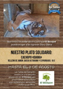 El Bosque Zoológico de Oviedo necesita ayuda y nosotros colaboraremos con nuestro cachopo solidario por las tigresas Zita y Diana. Donaremos 2 € por cada cachopo solidario que consumas en Las Tablas del Campillín hasta el 31 de agosto. Nuestro plato más premiado también tiene que servir para ayudar y mejorar nuestro entorno, nos parece una causa muy justa para El Bosque y para las tigresas.